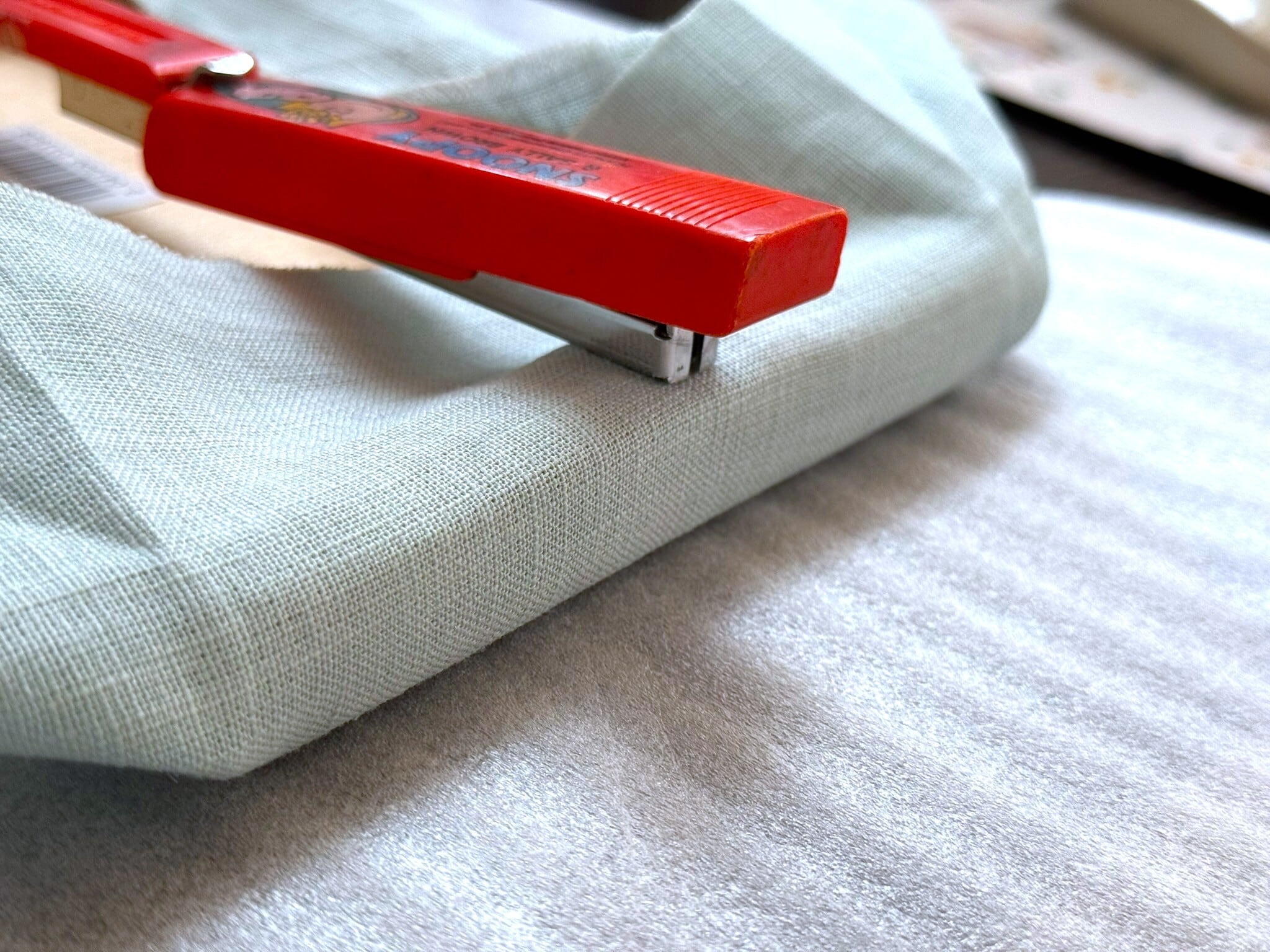 パネル仕立てはガンタッカーをお持ちでなくてもご自宅にある普通のホチキスでも可能です。(少しコツはいります)または、マスキングテープや、画鋲でもOK。